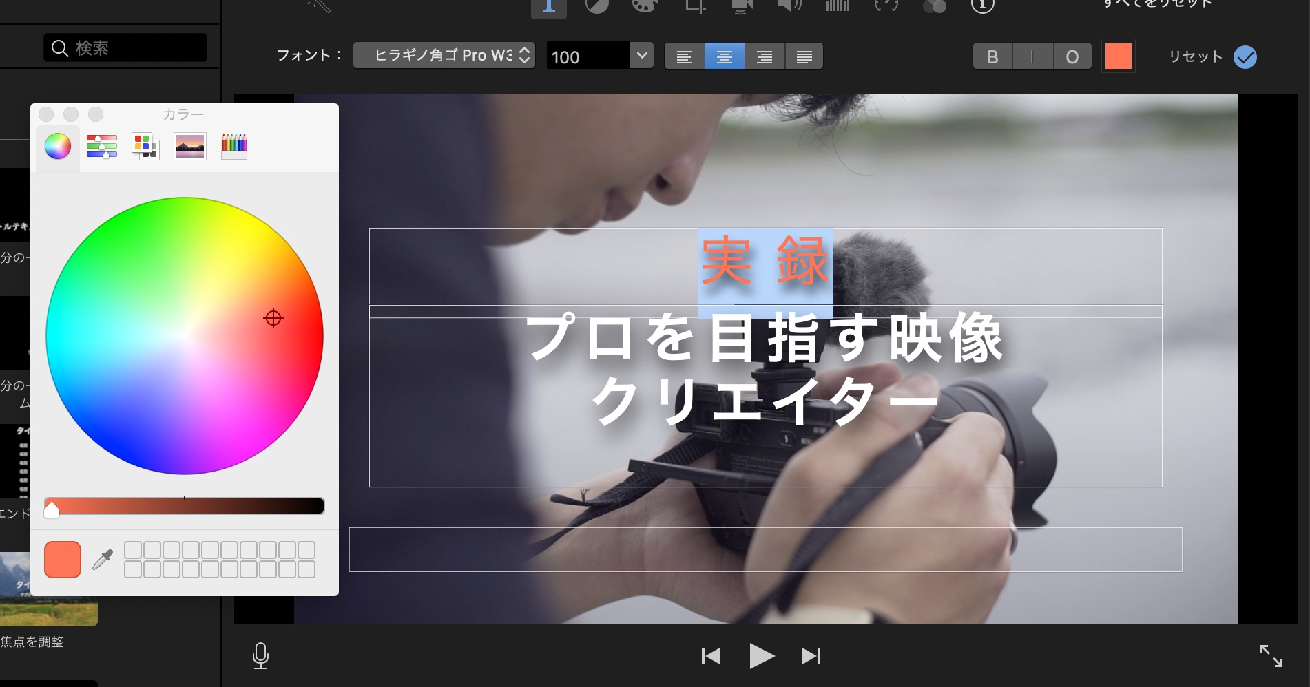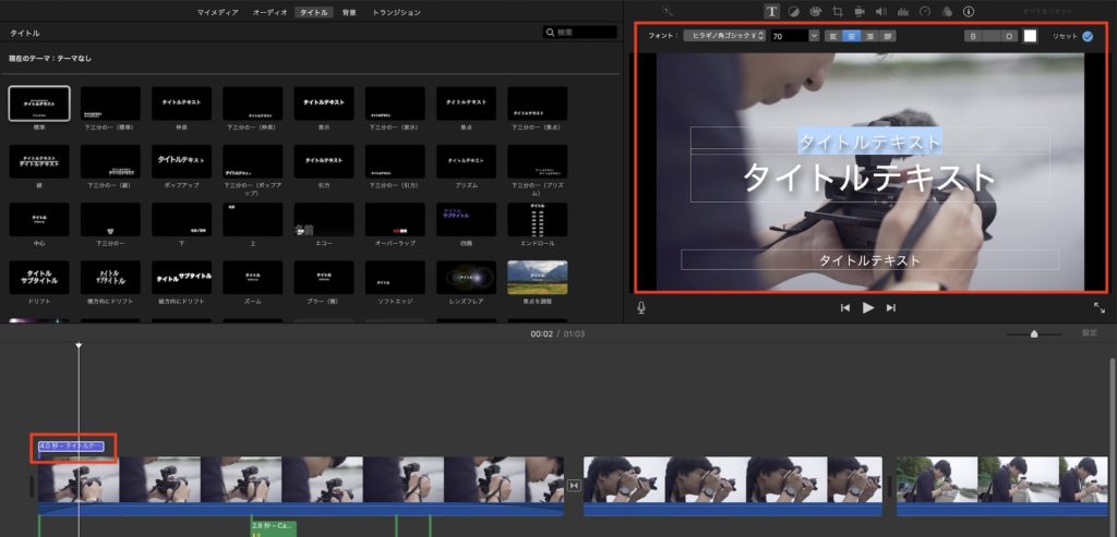タイトルを追加後またはタイムライン上でタイトルを選択していると、プレビューウィンドウで編集可能な状態になるので、テキストやフォント、色や書式などを設定出来るようになります。