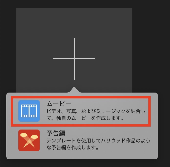 「+」アイコンをクリックすると「ムービー」と「予告編」が現れますが、好きなように映像編集を行いたい方は「ムービー」を、iMovieが用意するテンプレートを使って予告編のような映像を作りたい方は「予告編」を選びましょう。