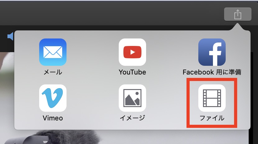 全ての編集が終わったら画面右上の「共有」アイコンをクリックして、書き出したい設定を選びましょう。パソコン上に保存するのであれば「ファイル」を選んでおけば問題ありません。