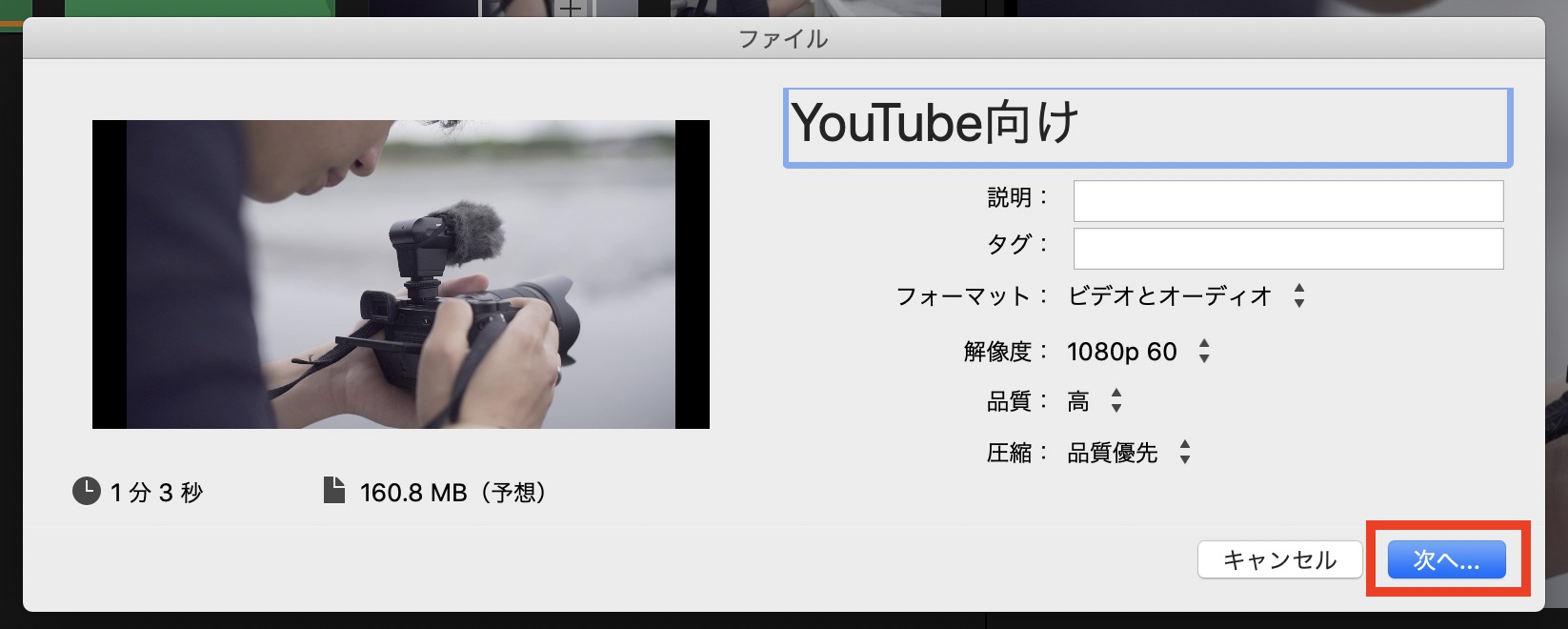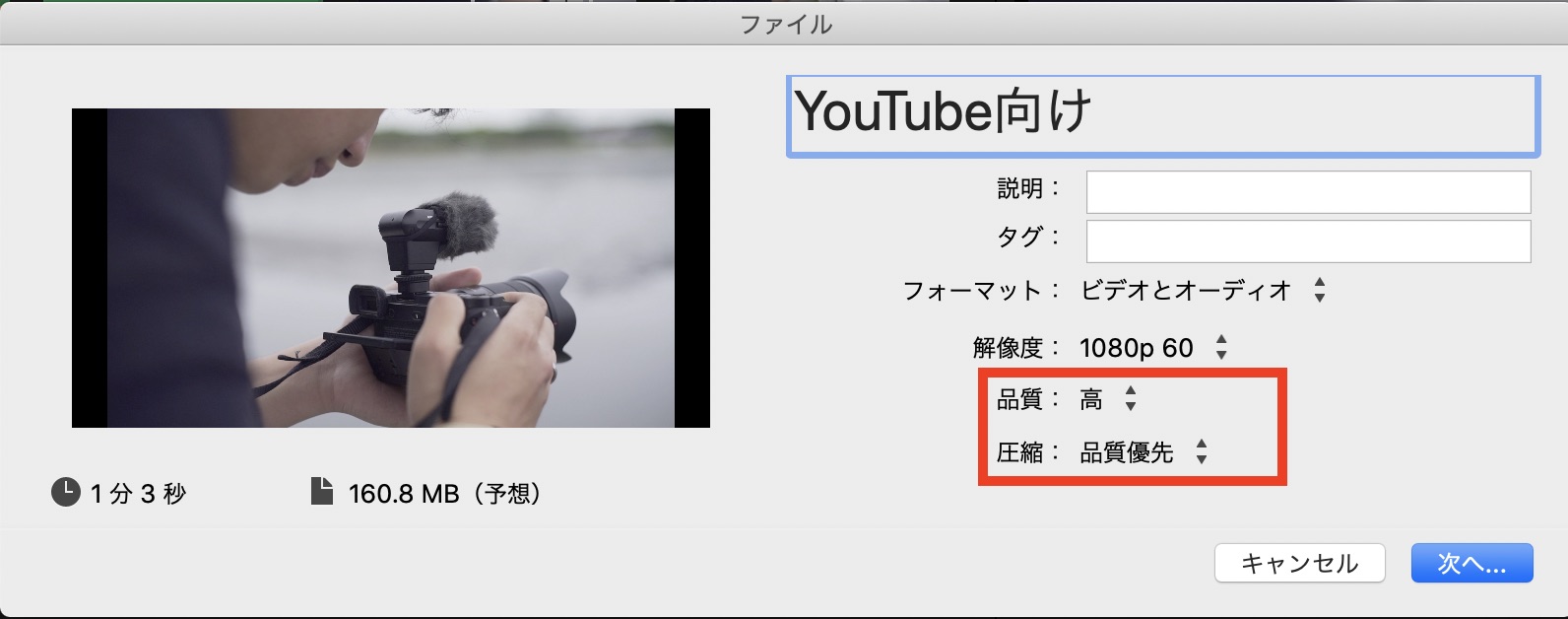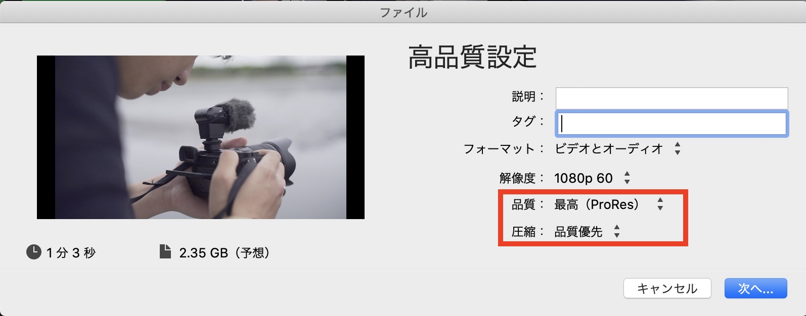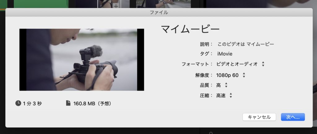 こちらはApple ProResコーデックを使用しているので、iMovieで利用できる設定の中では一番高品質ですが、デメリットとして動画のファイルサイズが大きくなってしまいます。