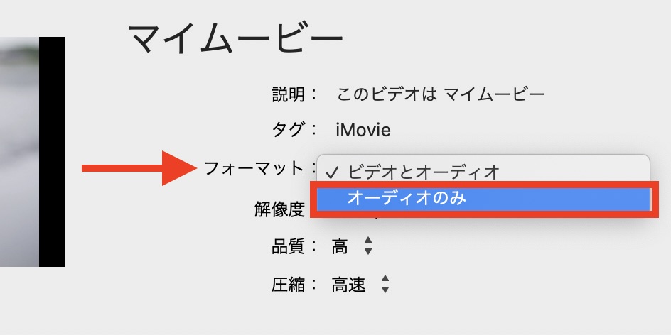 「フォーマット」ではプロジェクトのオーディオだけを書き出す際に使える「オーディオのみ」のオプションが用意されています。