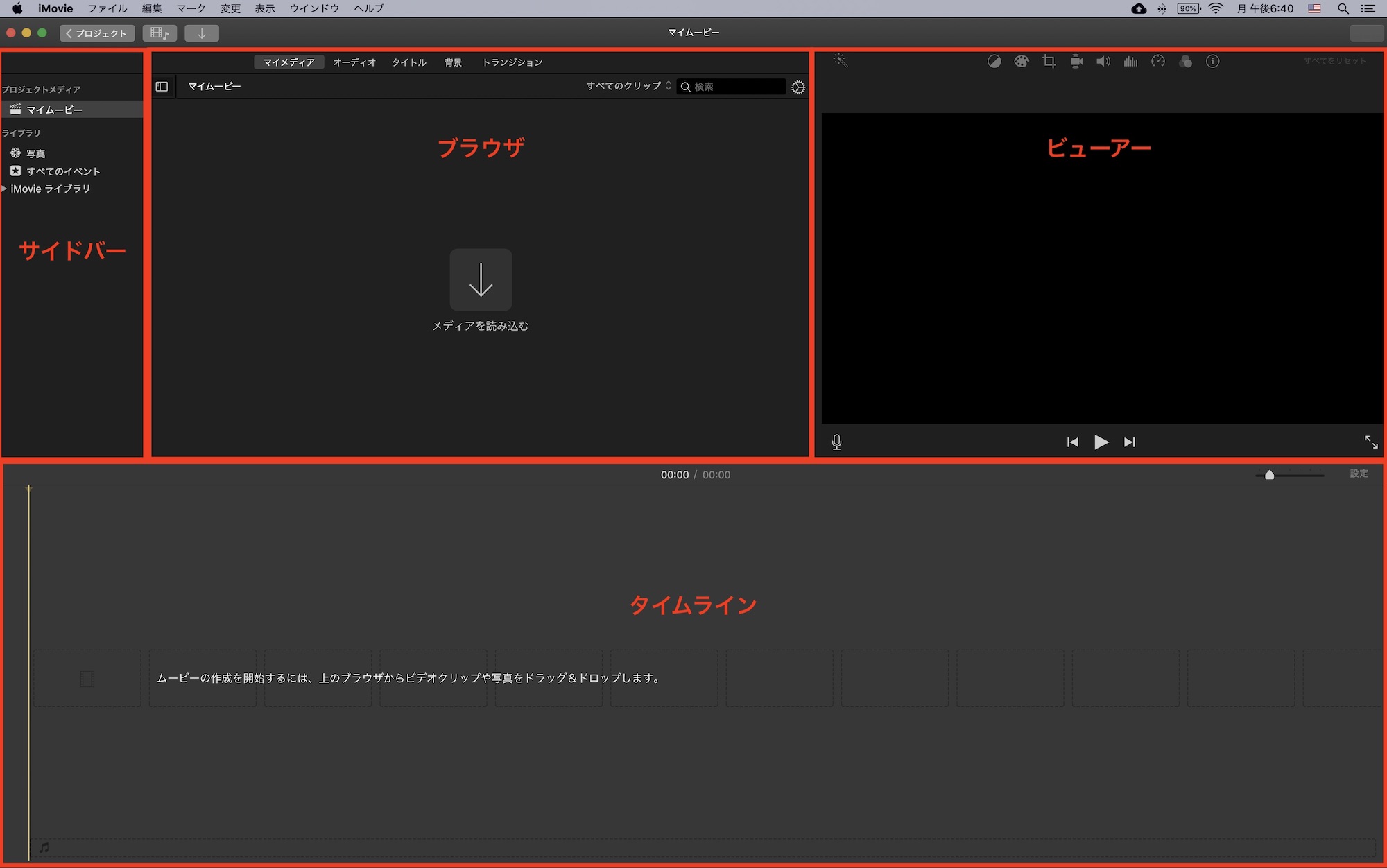 iMovieは大きく分けて4つの画面があります。左からサイドバー、ブラウザ、ビューワー、そしてタイムラインが用意されています。