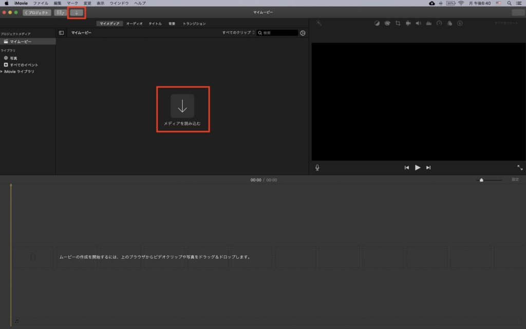 映像素材や写真などのメディア追加はブラウザにFinderからドラッグ・アンド・ドロップするか、「メディアを読み込む」または上部の読み込みアイコン、そして「Command + I」のショートカットを使って「読み込む」のウィンドウを表示させます。