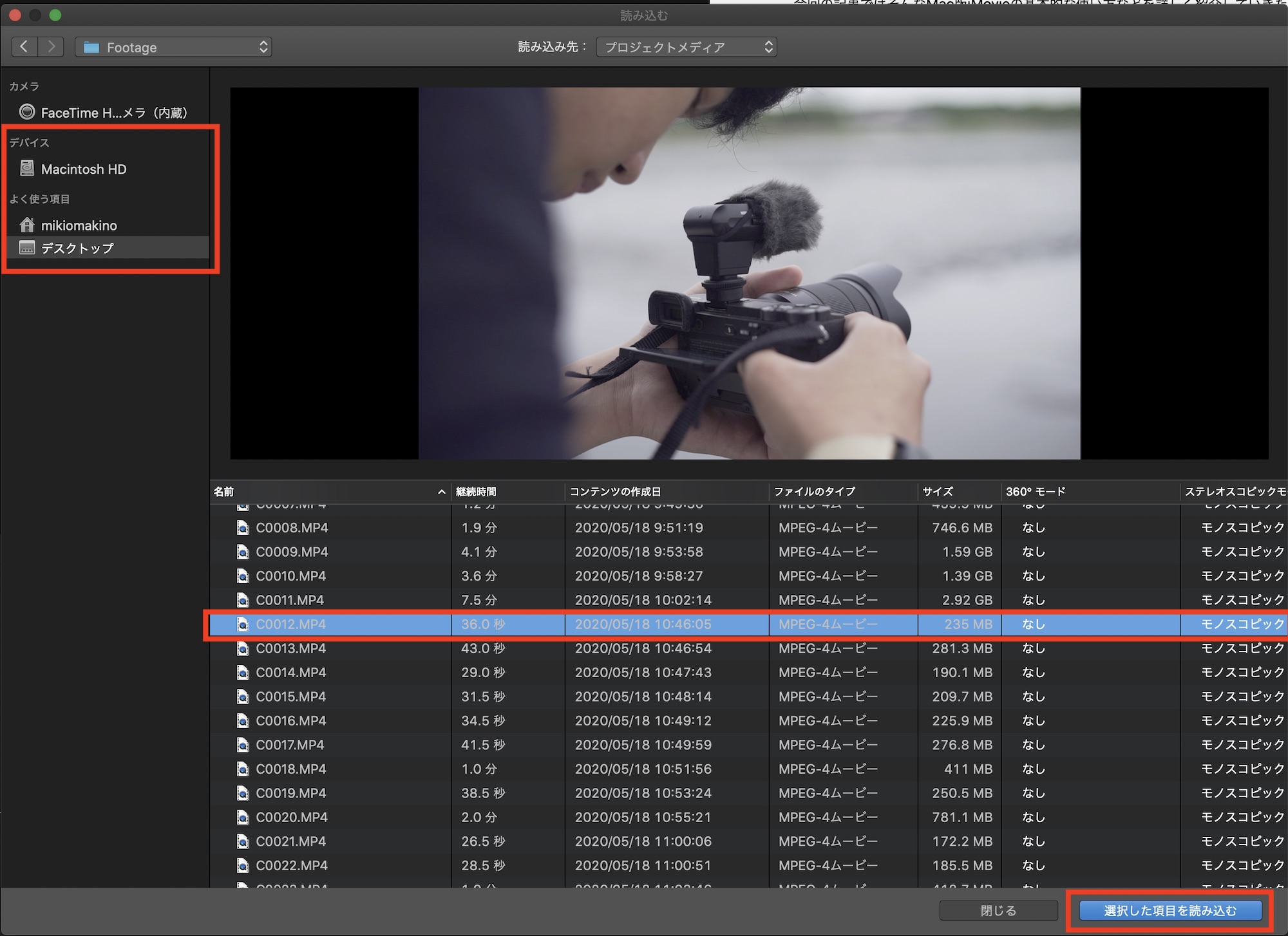 その後で読み込みたいメディアを複数選択するなどして、「選択した項目」をクリックしてiMovieに読み込みましょう。