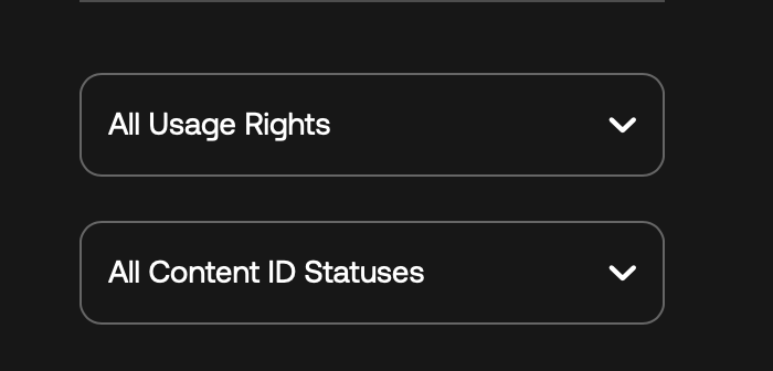 Audioの項目にあるロイヤリティーフリー音楽のページでは「All Usage Rights (全ての使用許諾)」と「All Content ID Statuses(全てのContent IDステータス)」が用意されています。