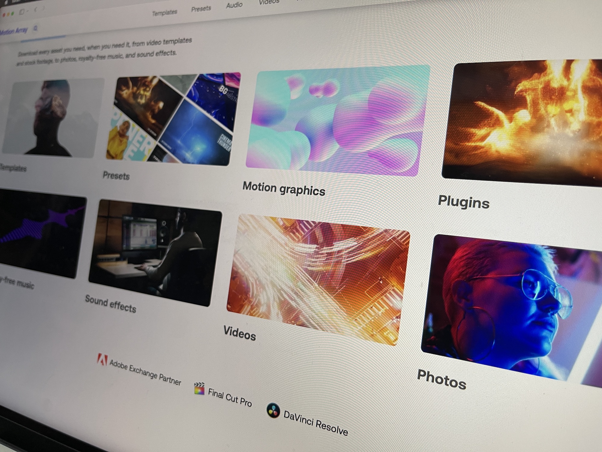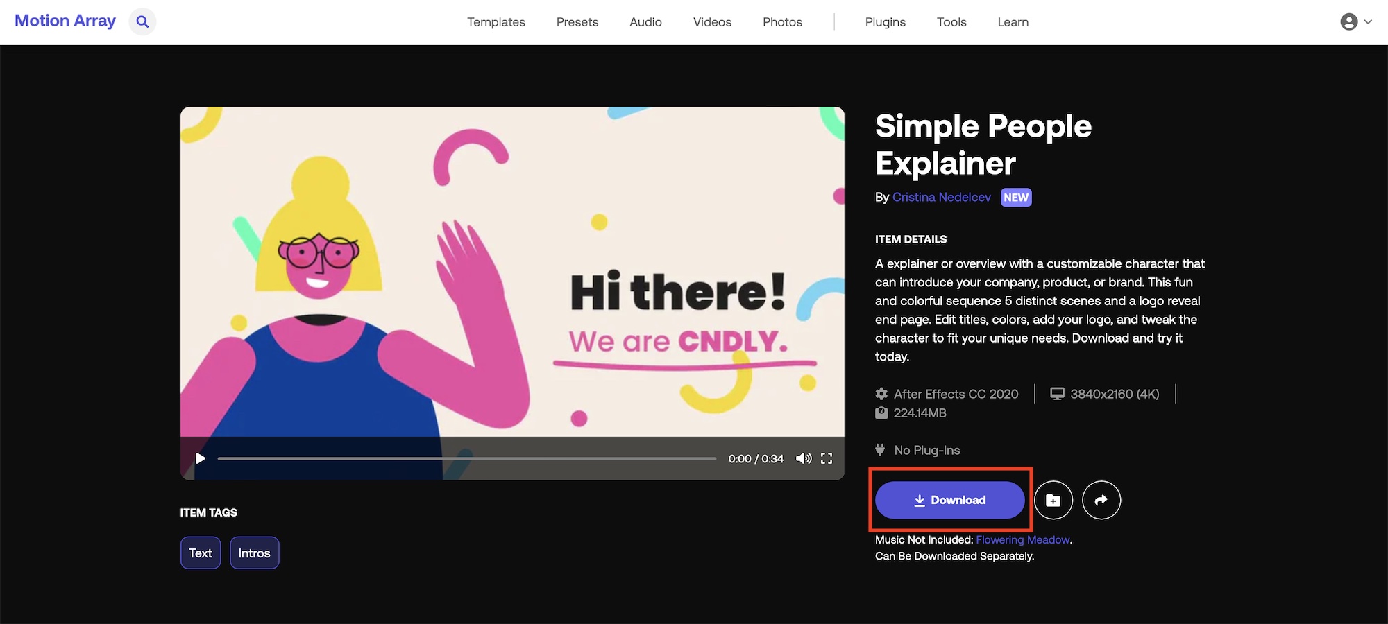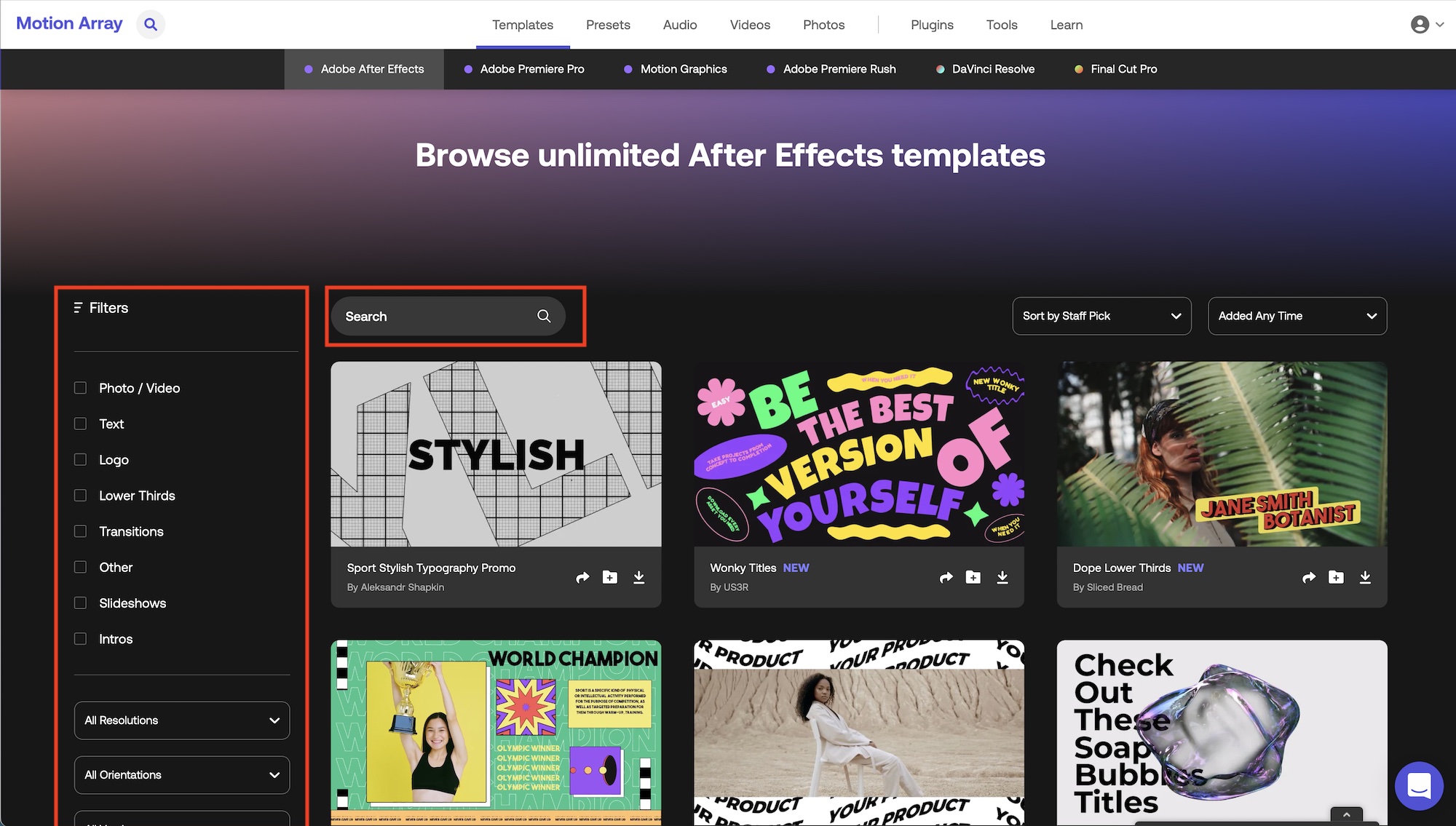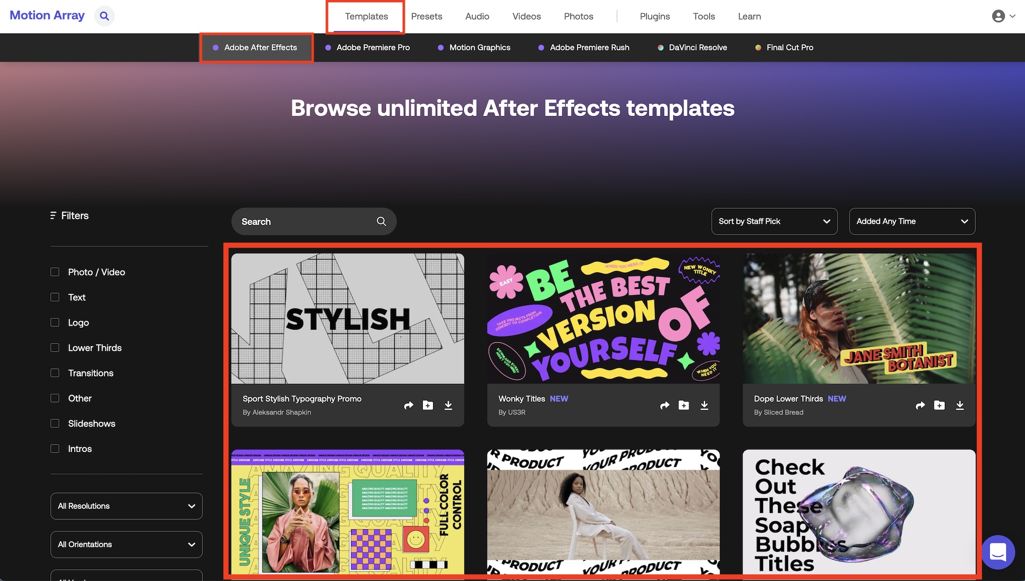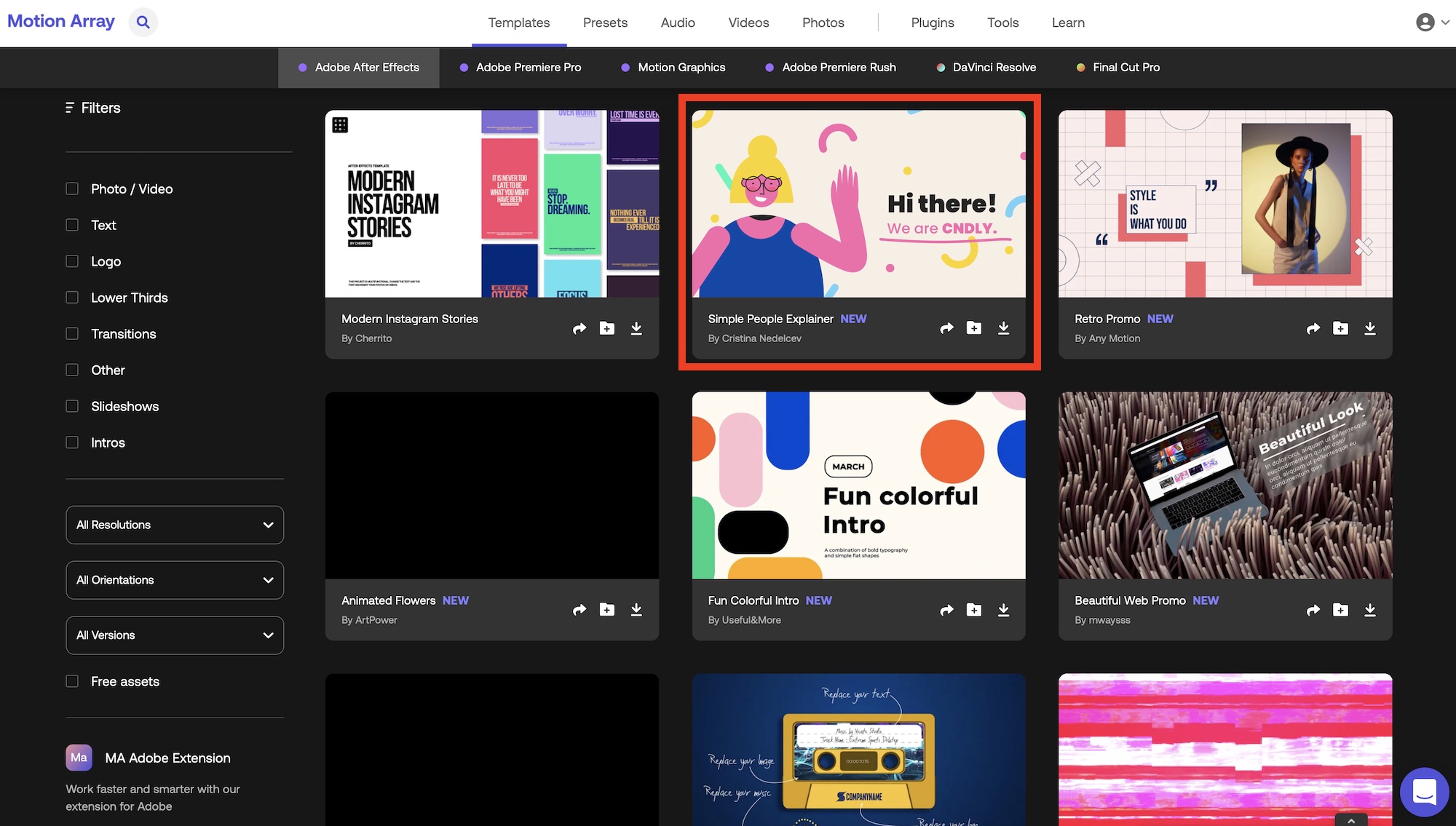 Motion ArrayでモーショングラフィックステンプレートやBGMなどのアセットを検索するには上部中央にある「Templates(テンプレート)」、「Presets(プリセット)」、「Audio(音源)」、「Videos(ビデオ)」、「Photos(写真)」から入手したいテンプレートのカテゴリを選択します。