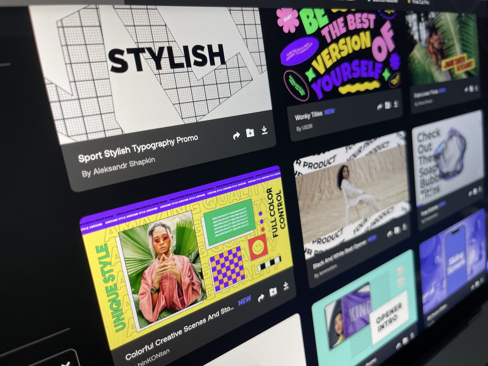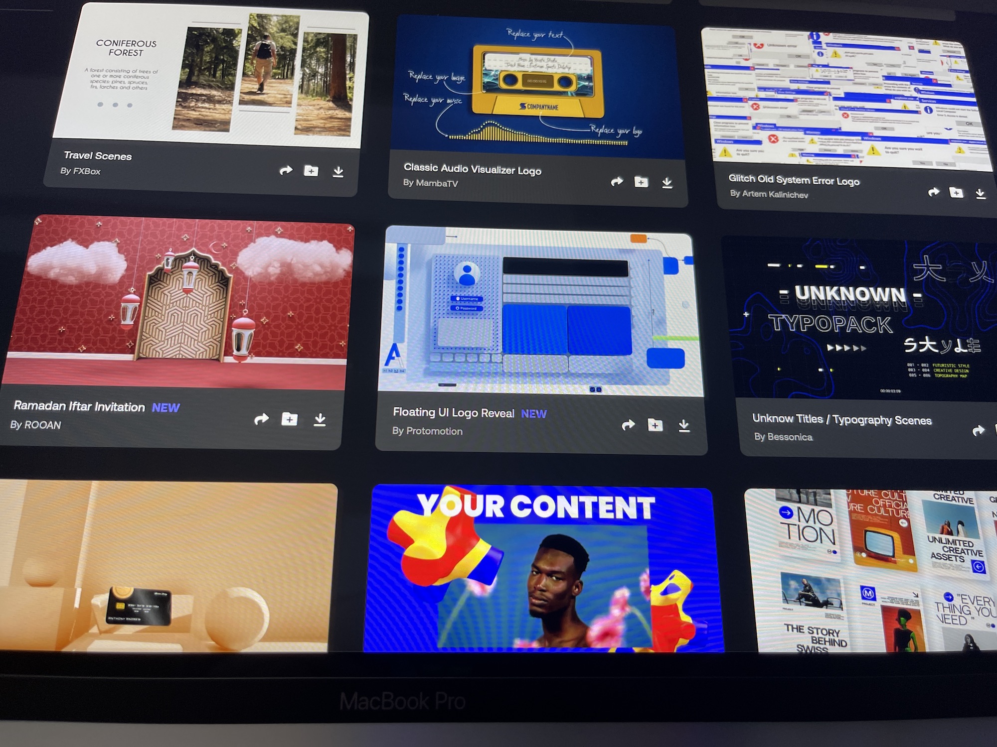 テンプレートはサムネイルで表示されるので、マウスオーバーして再生アイコンをクリックしてプレビューしたり、ダウンロードを行うことが出来ます。