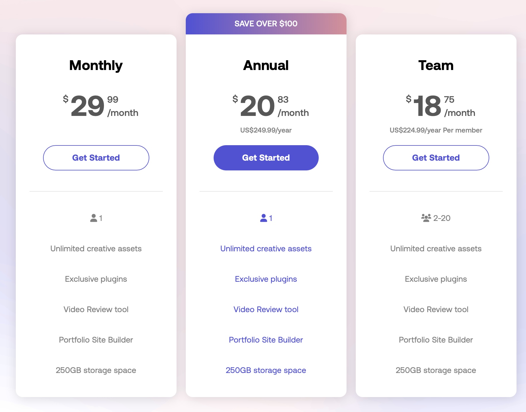 気になる料金設定ですが、Motion Arrayでは主に3種類のプランが用意されており、月額契約のMonthlyプランが29.99ドル/月、年間契約のAnnualプランが249.99ドル/年、そして2名以上のメンバーで利用するTeamプランがあります。