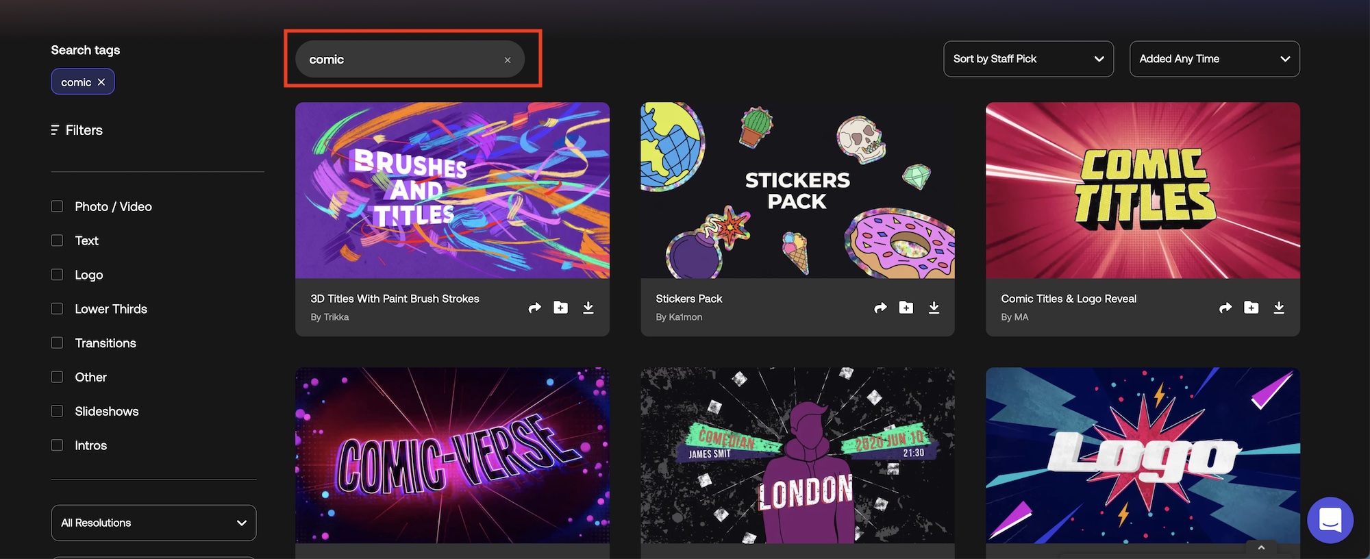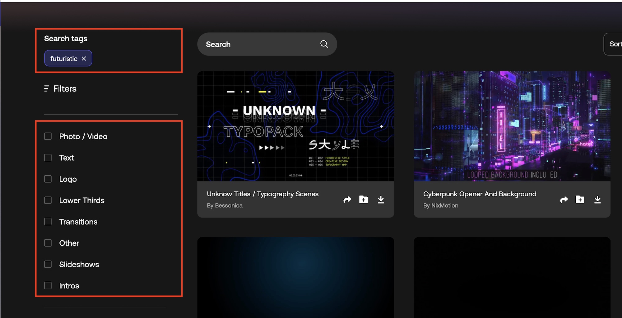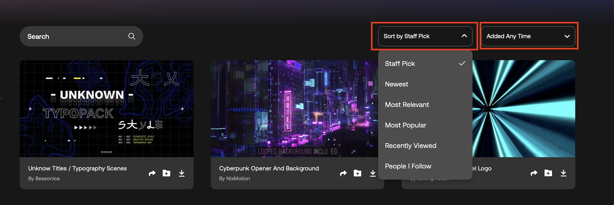 サムネイルをマウスオーバーするとプレビュー再生されるほか、「Search」の検索窓でキーワードを入力したり、左側のフィルタを使ってアセットを検索することが出来ます。