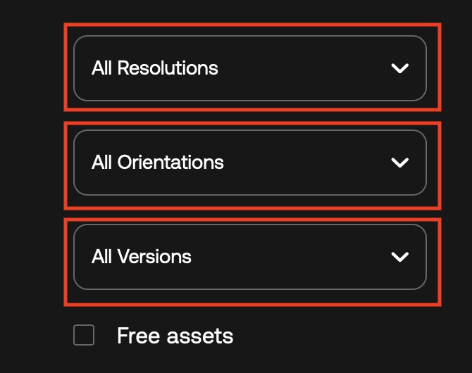 さらにその下にあるドロップダウンメニューでは「Resolution(解像度)」、「Orientation(向き)」、「Versions(アプリのバージョンアップ)」が用意されており、プロジェクトに合わせたアセットを表示できます。