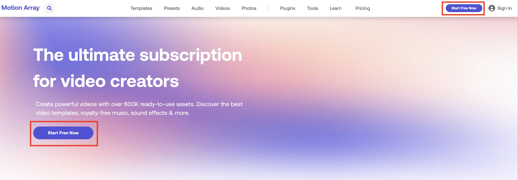 Motion Arrayのウェブサイトにアクセスし、「Start Free Now」をクリックします。