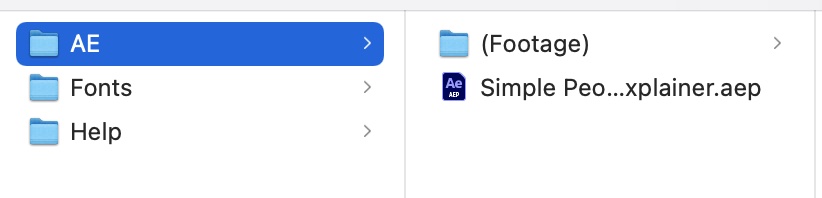 入手するアセットによって用意されているファイルなどが異なる場合もあると思いますが、前の項目で入手したAfter Effectsのテンプレートを例にしてみると、下のようにAfter Effectsのプロジェクトファイルやフォント、ヘルプのファイルが用意されています。