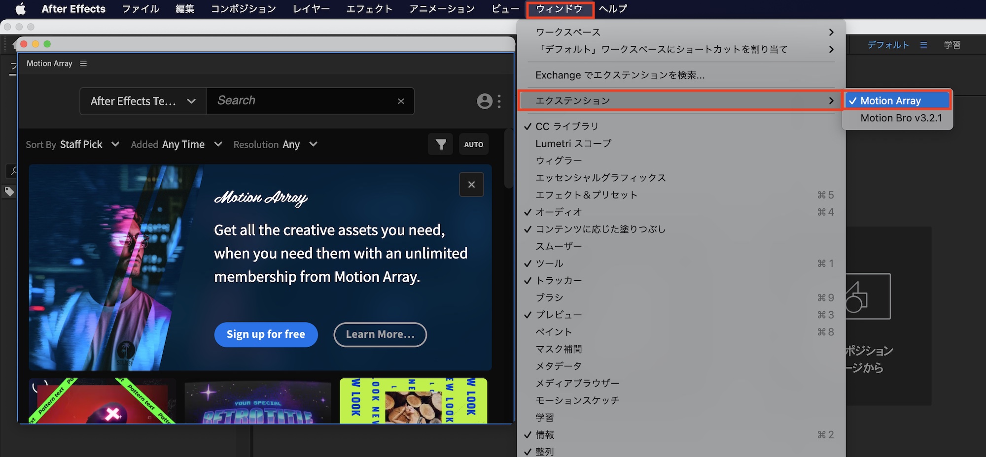 エクステンションはPremiere Pro、After Effectsの上部メニューの「ウィンドウ」、「エクステンション」から「Motion Array」をクリックするとウィンドウが追加されるようになります。