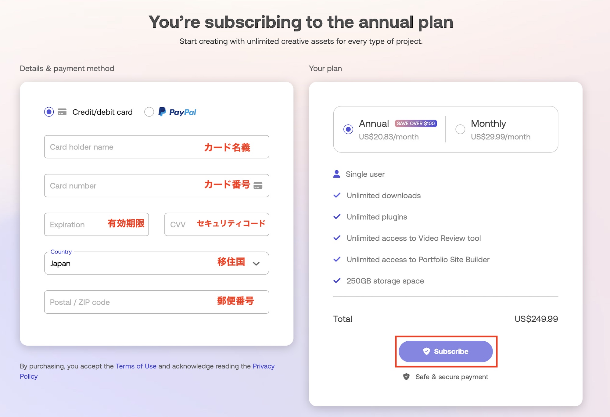 基本的にMonthlyまたはAnnualのプランのいずれかを選ぶことになると思いますが、年間契約のAnnualプランは一度に掛かるコストは高いですが、月額にすると20.83ドルになるため、コストを抑えたいという方はAnnualプランを選択するのがベストです。
