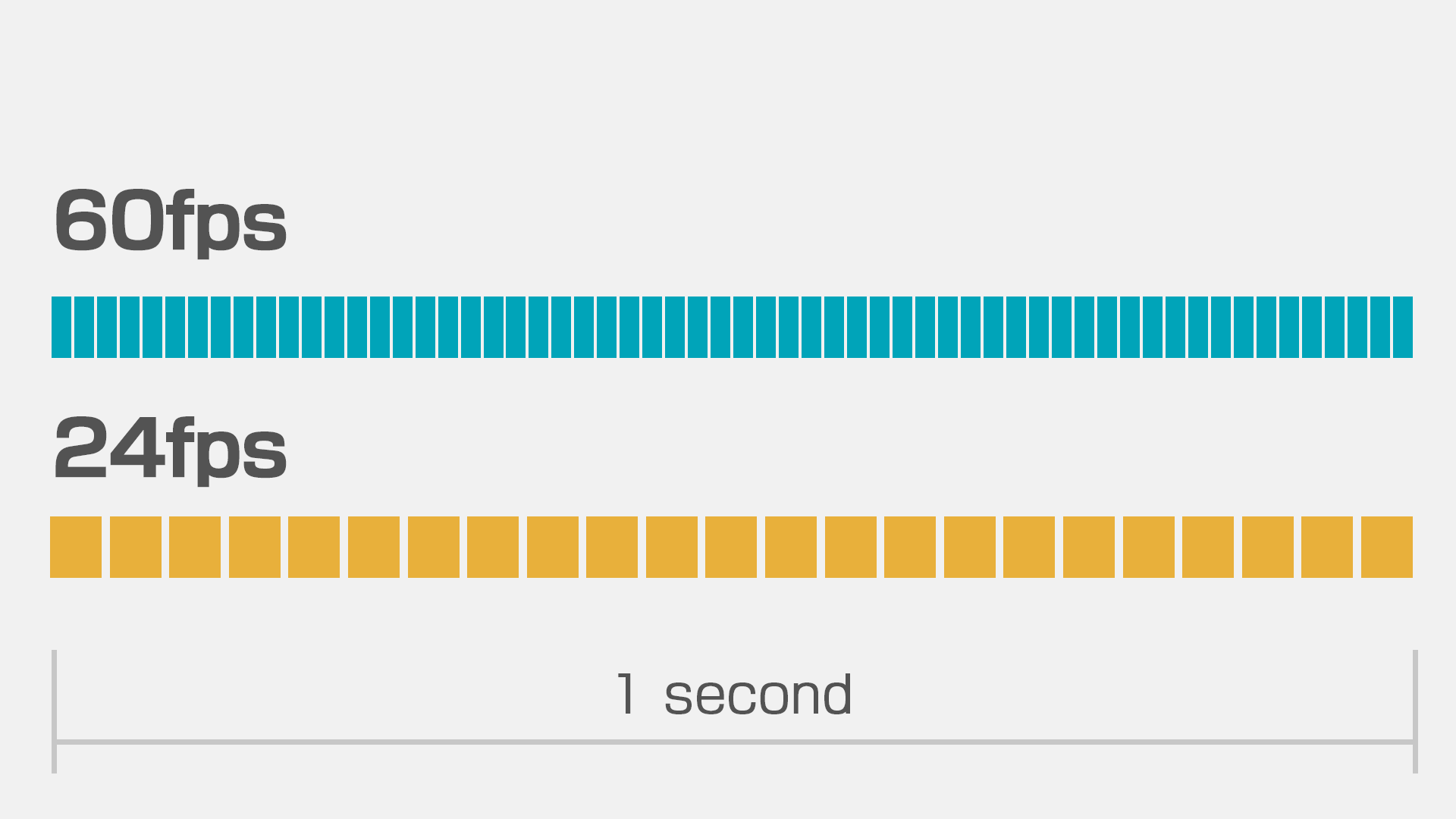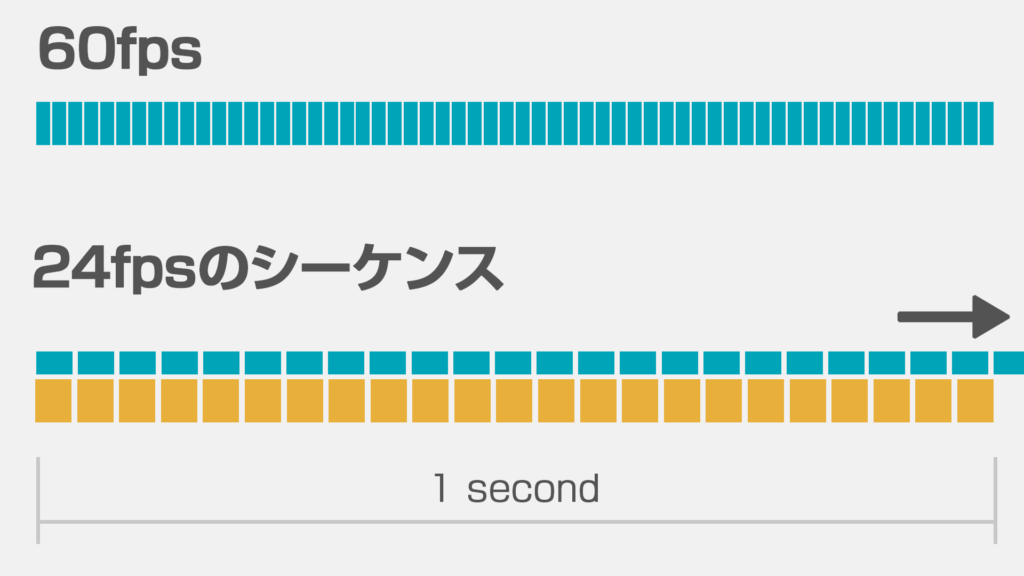 通常スピードの映像をスローモーション化?と思うかもしれませんが、まず60fpsと24fpsを比べた場合、一秒間に収まるフレームは以下のようなイメージになります。