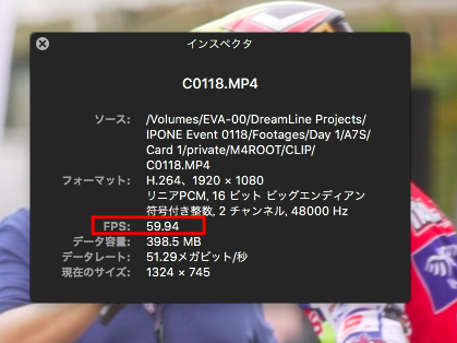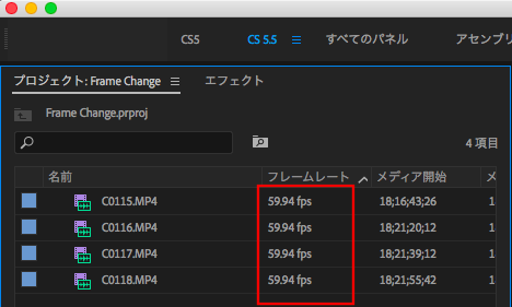 プロジェクトウィンドウを確認すると読み込んだ映像素材(フッテージ)が「59.94fps」になっているのがわかります。これはSony A7siiの60pで撮影されたものです。