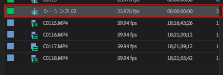 プロジェクトウィンドウでシーケンスのフレームレートが「23.976fps」になったことを確認してください。