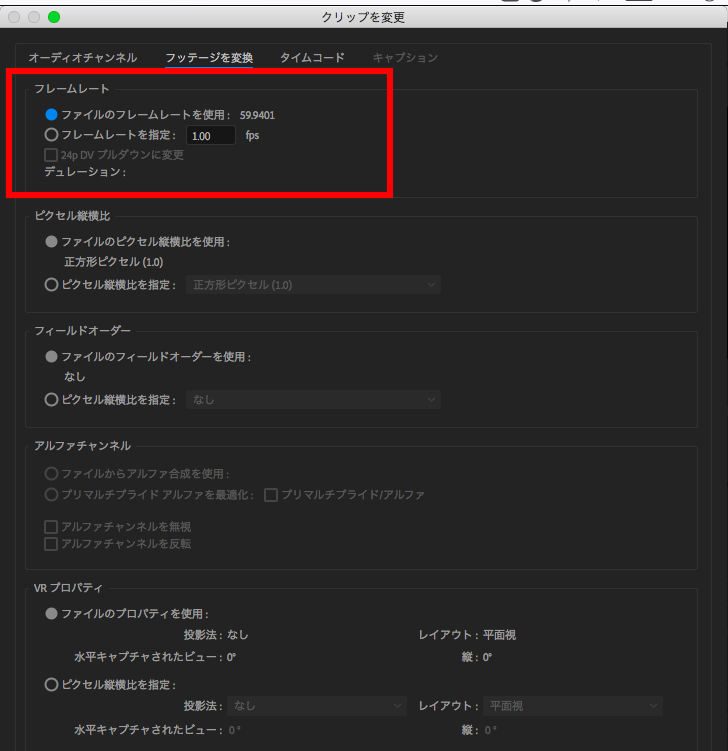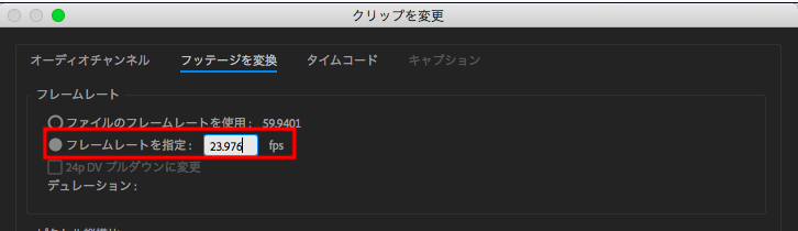 この様な画面が出てくるので、「フレームレート(Frame Rate)」内の「フレームレートを指定(Assume this frame rate)」の項目に24fpsであれば「23.976」に30fpsであれば「29.97」の数値を入力して「OK」をクリックします。