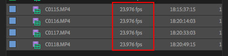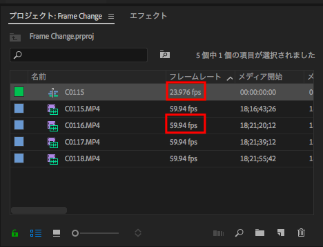 するとプロジェクトウィンドウ内にあった59.94fpsのフッテージは全て23.976fpsに無事変換されるようになりました。このフッテージを後はシーケンスに挿入すればスローモーションの素材で編集をする事が出来ます。