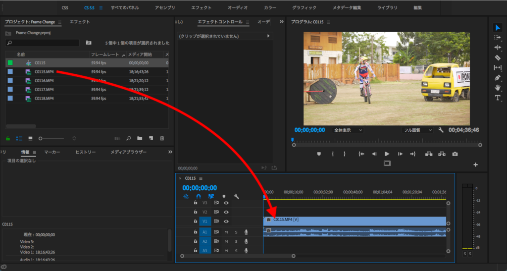 いつものように読み込んだフッテージをそのままシーケンスに移すと、シーケンスのフレームレートが自動で59.94fpsに設定されてしまい、このままだとスローモーションの編集を行うことが出来ません。