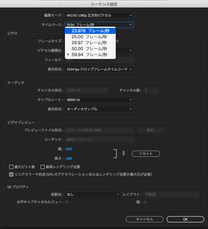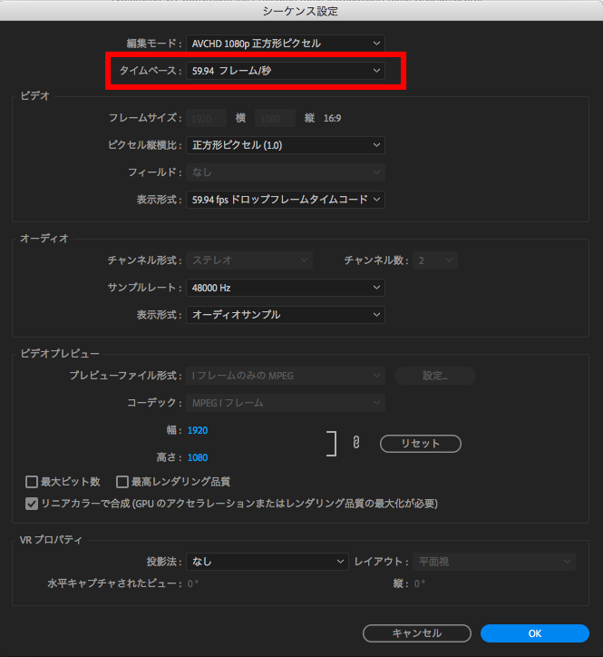それでは「シーケンス設定」内の「タイムベース」を 「23.976フレーム」にすれば良いんじゃないの?と思ってしまいますが、これだとシーケンスのフレームレートは23.976fpsであるものの、フッテージそのものは59.94fpsを保持している状態なのでスローモーションどころか、フレームを失う状態になるので、注意が必要です。