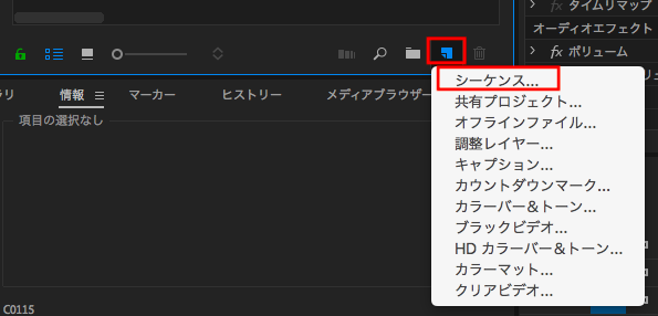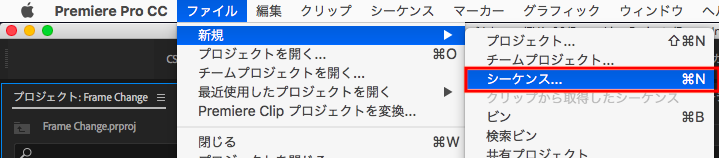 まず新しくシーケンスを作成します。プロジェクトウィンドウにある「新規アイコン」または「ファイル / 新規」の項目からシーケンスを選びます。