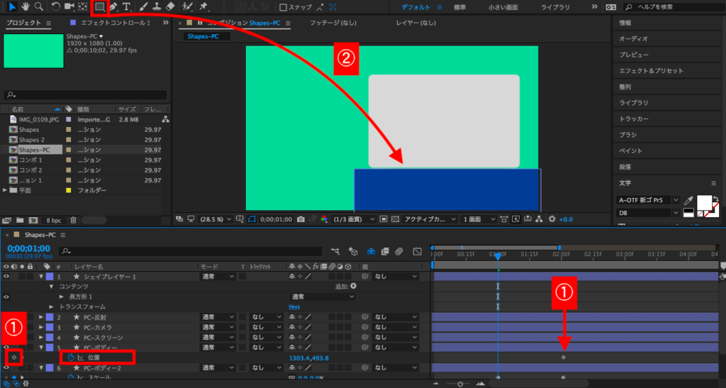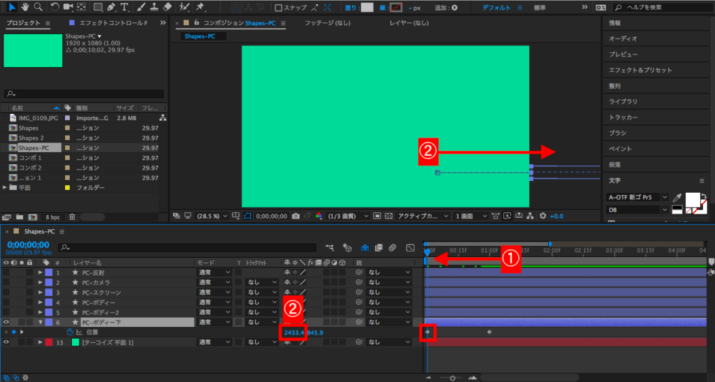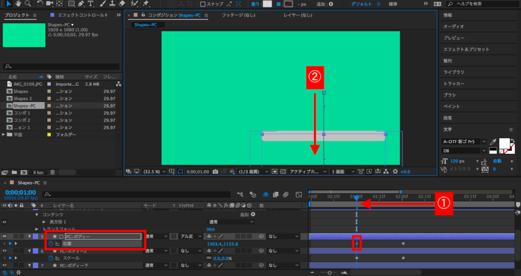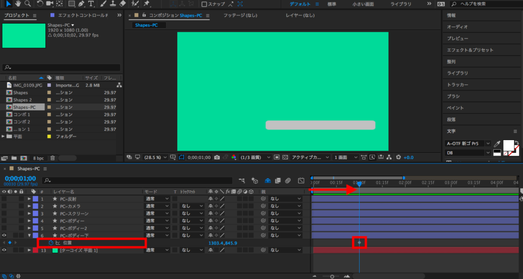 まずはボディの下の部分からアニメーションを作っていきましょう。右から現れる演出を作りたいので、1秒にタイムインディケーターを持ってきて「位置(ショートカット:P)」にキーフレームを追加します。