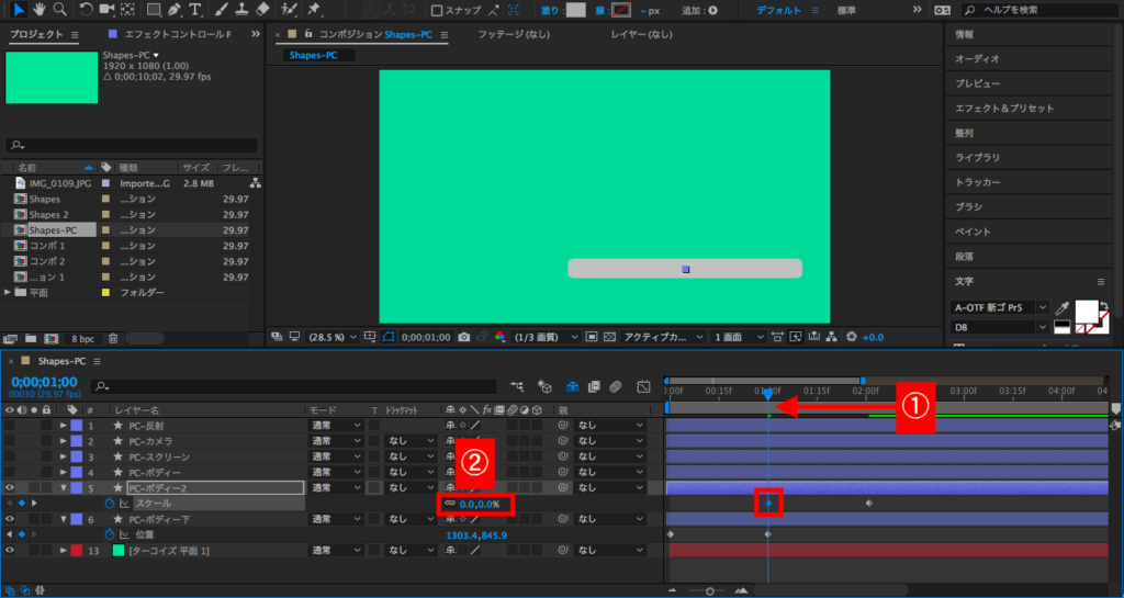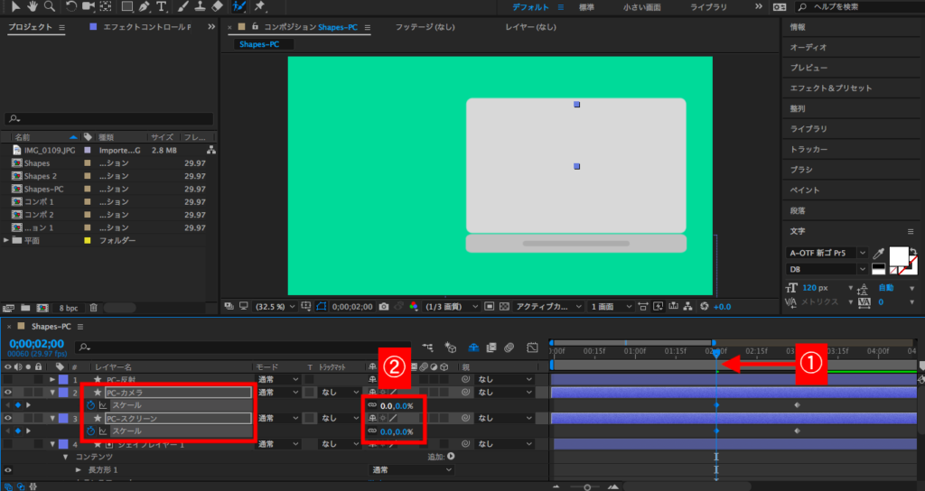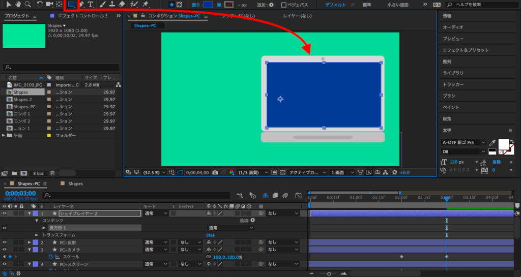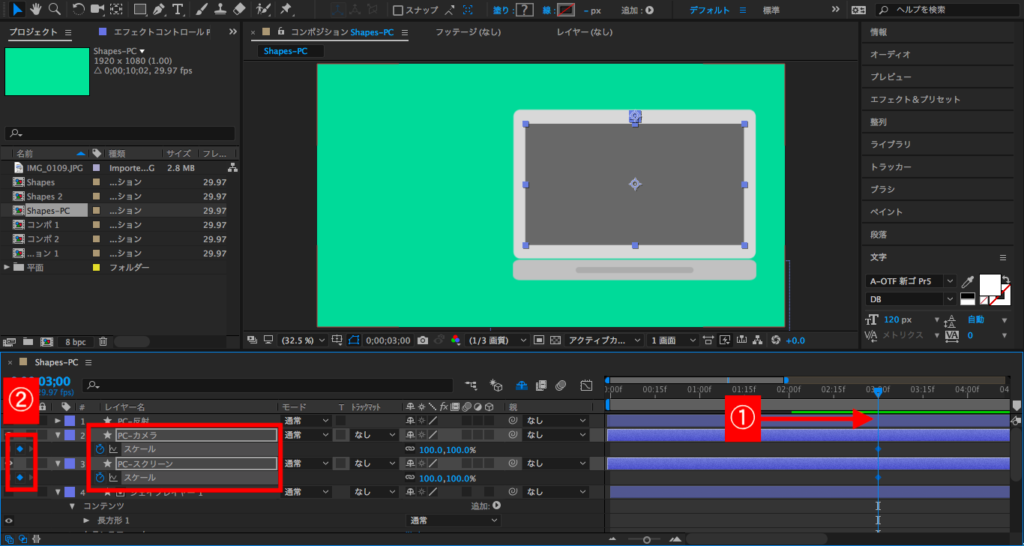 スクリーンとカメラの部分は同じタイミングでスケールを使用して登場させたいので、スクリーンとカメラのシェイプを選択しタイムインディケーターを3秒に持っていって、「スケール」のキーフレームを追加します。