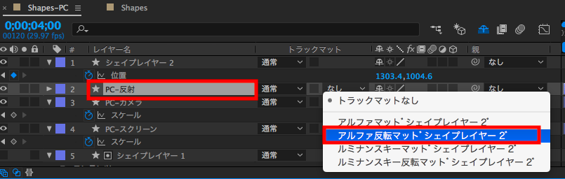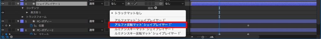 このままの状態であるとアニメーションが成り立たないので、反射のシェイプを選択した上でトラックマットの「アルファ反転マット」をクリックして、先ほど追加したシェイプを透明にさせます。