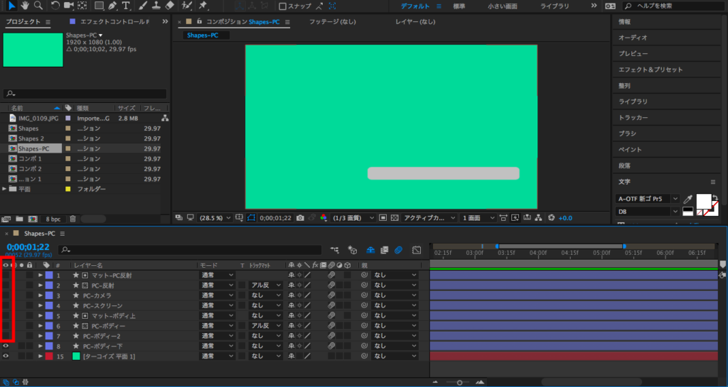 またアニメーションを制作する際は、パーツを一つずつ動かしていく方がやりやすいと思うので、まだ操作を行わないオブジェクトには「ビデオの表示/非表示」を使用して、一度コンポジションから非表示にするのがベストかもしれません。