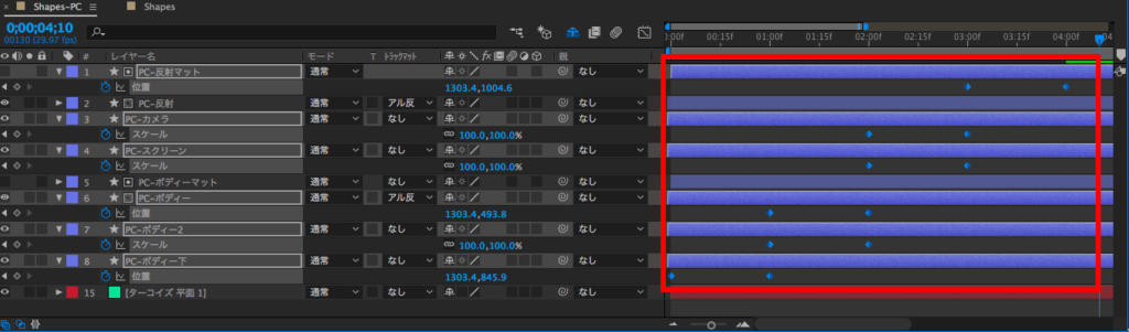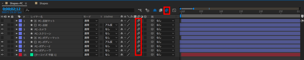 最後はタイムラインのモーションブラーの設定をオンにし、パソコンのレイヤーを全て選択してモーションブラーを付け足します。