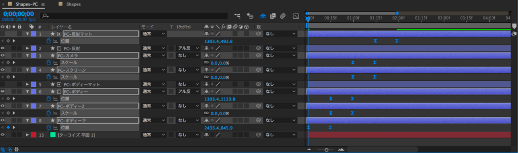 最後は反射部分になります。こちらは反射のシェイプオブジェクトにはアニメーションを行わないものの、代わりにトラックマットで使用するシェイプにキーフレームを付けたします。