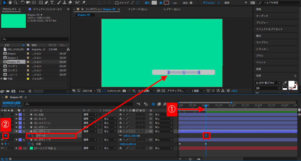 次にタイムインディケーターを1秒に移動させてボディー下の線のシェイプを選択し、「スケール(ショートカット:S)」を開きます。数値が100%になっていると思うので、その状態でキーフレームを追加します。