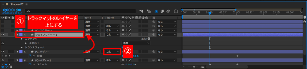 新しく追加したシェイプは上部ボディーレイヤーの上に来るように配置し、上部ボディーのシェイプを選択した上でトラックマットから「アルファ反転マット」を選択すると、そのシェイプが透明になります。