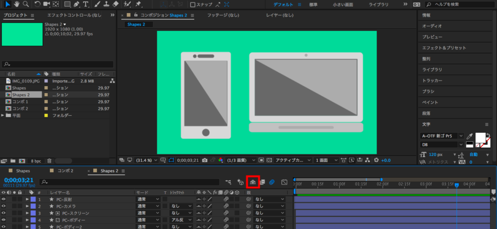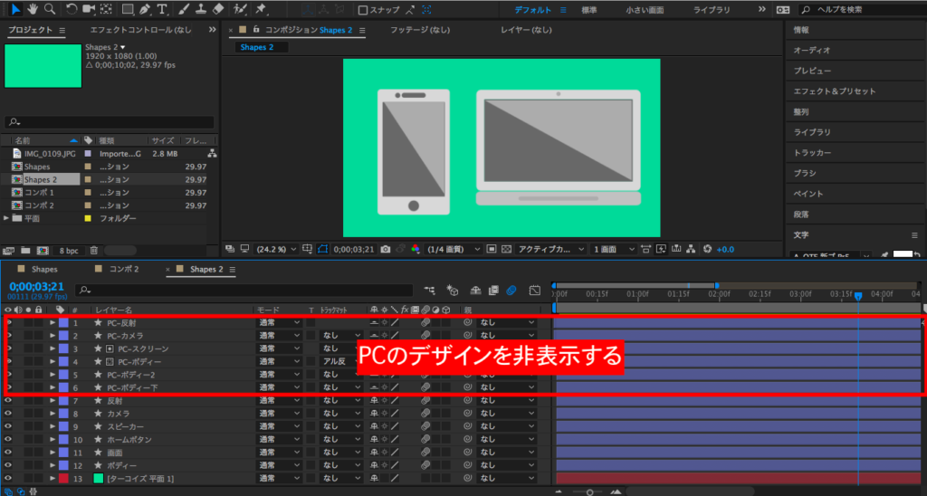 まずはスマートフォンのアニメーションを作っていくのですが、タイムライン上にスマートフォンとパソコンのシェイプがあり、見づらいと思うので「シャイ(Shy)」のツールを使って、パソコンのレイヤーを非表示にしましょう。