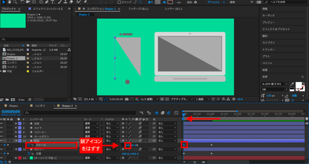 タイムインディケーターを0秒に持っていって、「スケール」の数値を全て「0%」に変更します。