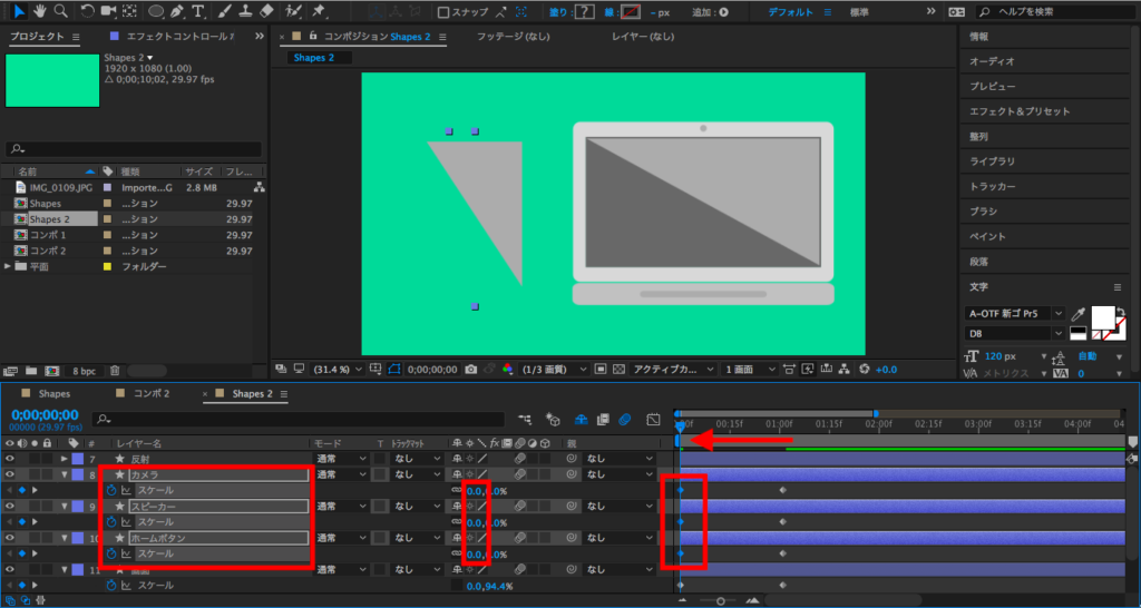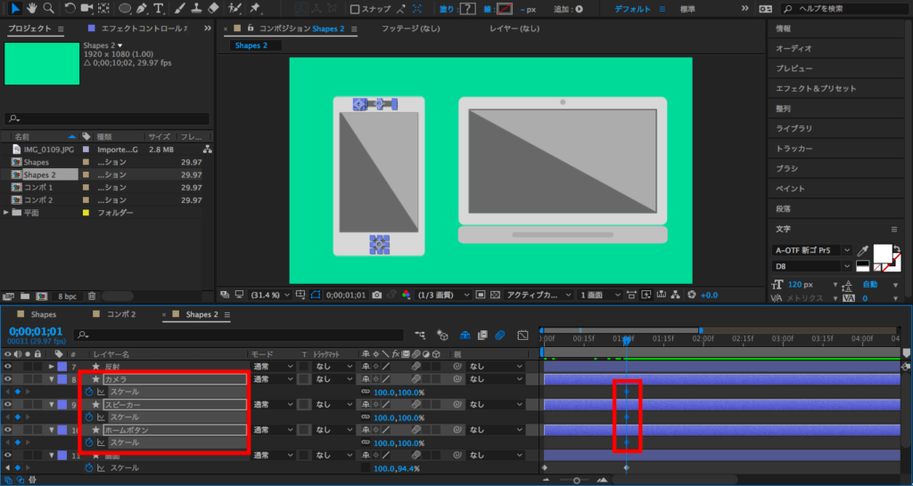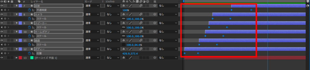 ホームボタン、スピーカー、フロントカメラもスケールで表現させたいので、3つのレイヤーを選択して「スケール」にキーフレームを追加します。