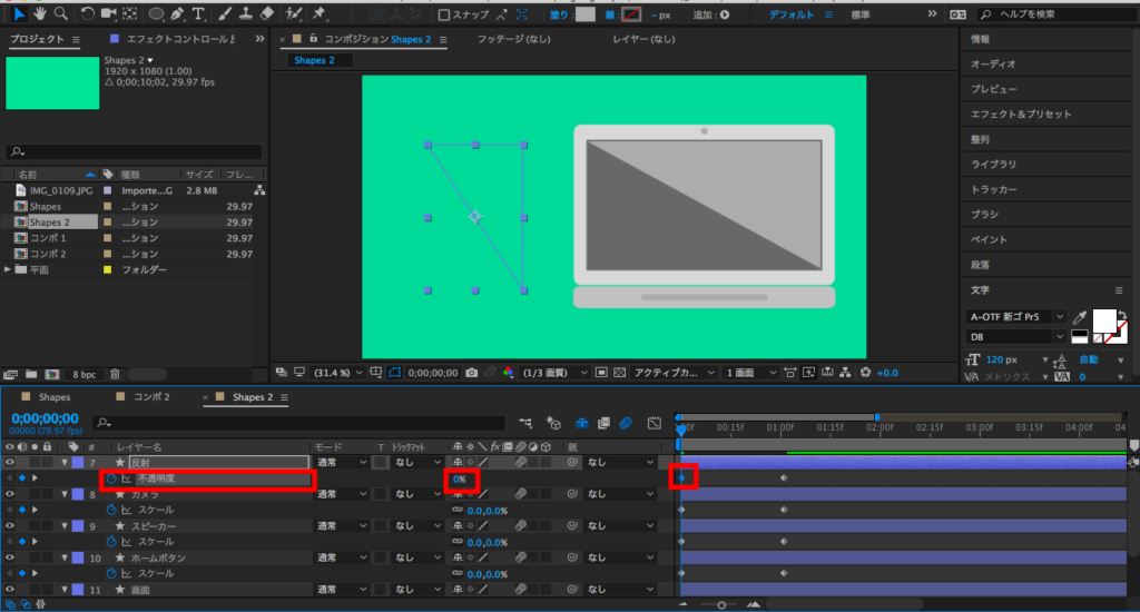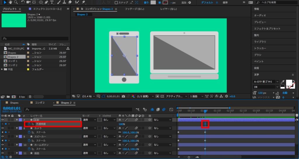 反射部分はシンプルに不透明度を使用しましょう。1秒に「不透明度」のキーフレームを追加します。
