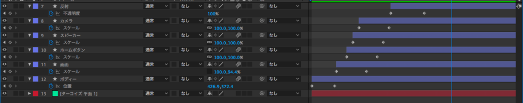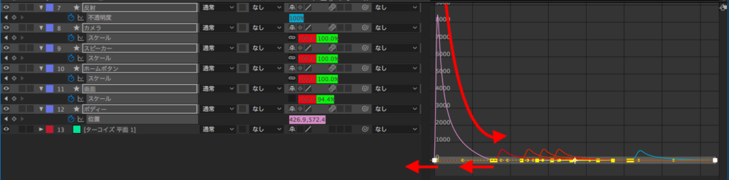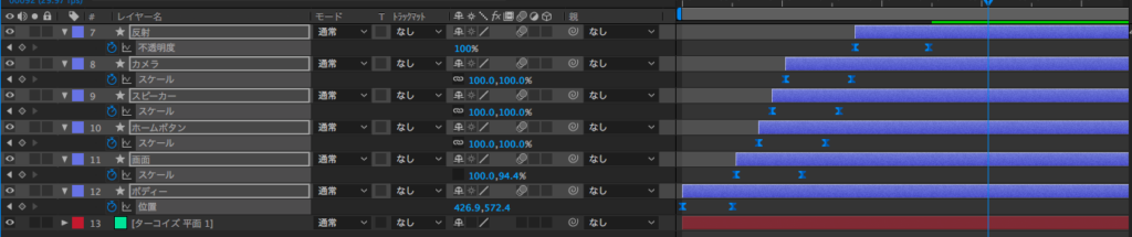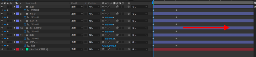 ボディが出たらスクリーンが出て、数フレーム遅れでホームボタン、スピーカー、カメラが現れて最後に反射が表示されるよう、レイヤー少しずつ移動させます。