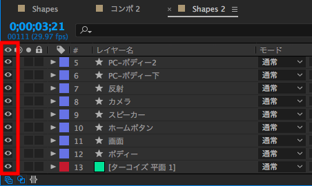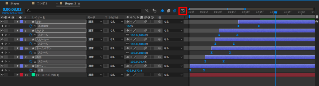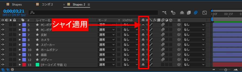 しかし、このままでは何も起きないので、今度はタイムラインにあるシャイボタンをクリックします。すると選択したレイヤーが全てシャイします。