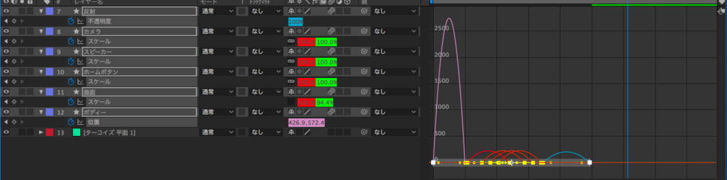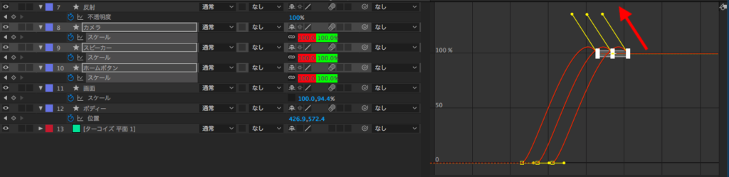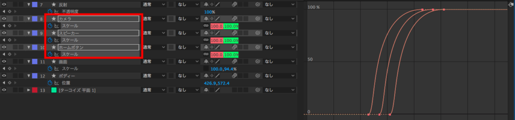 筆者は速度グラフの他にも「スケール」のプロパティで使用したレイヤー(ホームボタン、スピーカー、カメラ)の「値グラフ」も変更しました。