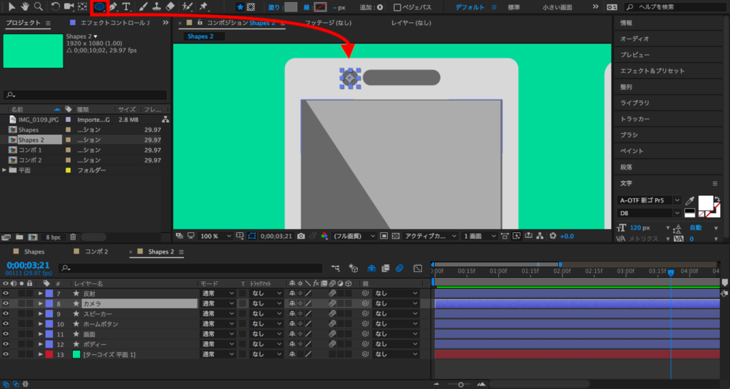 前回のチュートリアルではスマートフォンにカメラを付け足すのを忘れていたので、今回新しくシェイプレイヤーの楕円形ツールを使って追加しました。