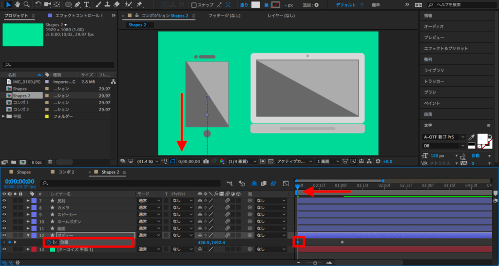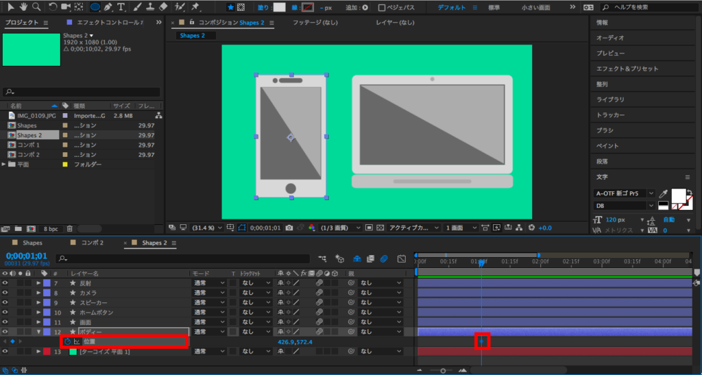 まずはボディから。ボディは画面の下から登場させるようにしたいので、1秒頃に「位置」のキーフレームを追加します。そして0秒にタイムインディケーターを持っていって、ボディの位置を画面の下に移動させ、キーフレームを追加します。