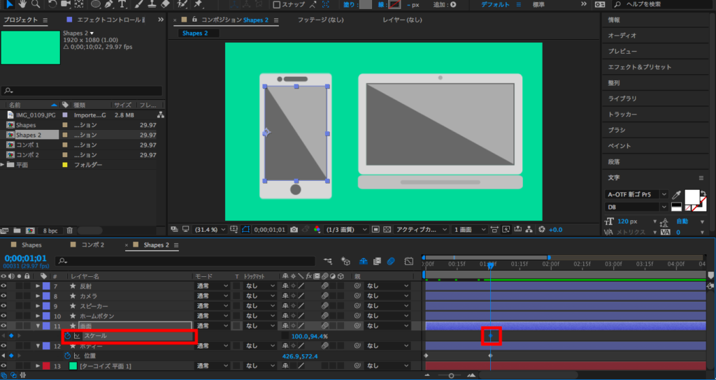 シェイプレイヤーの使い方やスマートフォン、パソコンのデザインについてはこちらの記事に詳しく紹介しているので、その記事を参考にして一から作るのも良いですし、素材をダウンロードしてこちらのチュートリアル見て作るのも良いと思います。