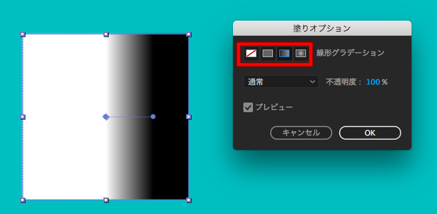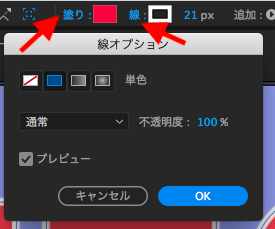 色が表示されている所をクリックする事で好きな色に変更することが出来ます。また「塗り」、「線」の文字をクリックする事で、塗りや線の非表示、単色、グラデーションなどの表示オプションが出てくるので、それぞれ指定することが出来ます。