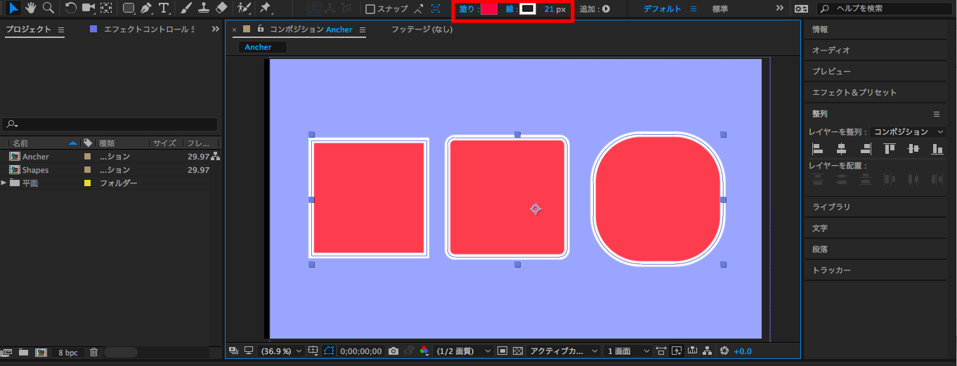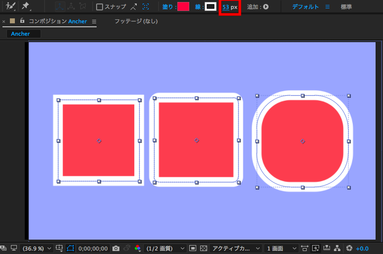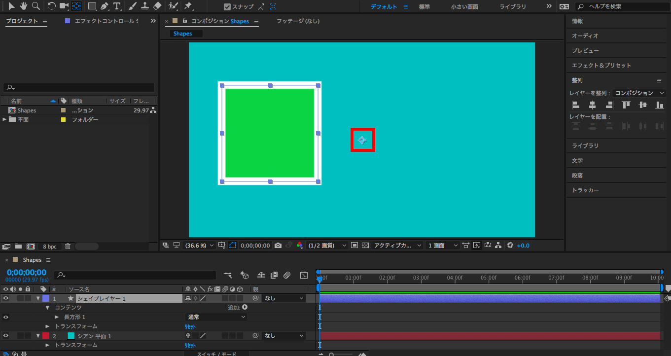 シェイプをアニメーションする時にアンカーポイントの設定がしっかり行われていないと、回転や位置を調整するのが少々面倒になる可能性があります。そのため、シェイプを作った後はアンカーポイントを中央に変更する事をオススメします。