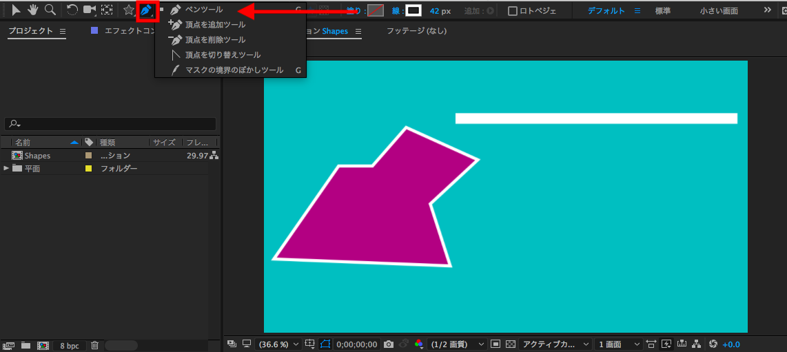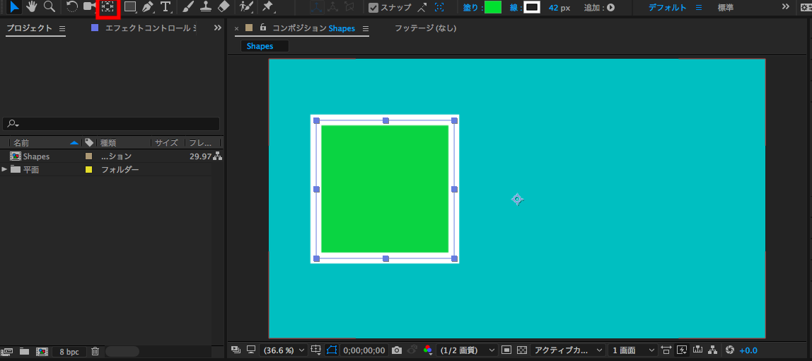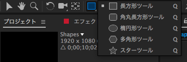新規プロジェクト・新規コンポジションを設定した後で、上部にあるツールバーからシェイプツールを選択して図形を追加することが出来ます。