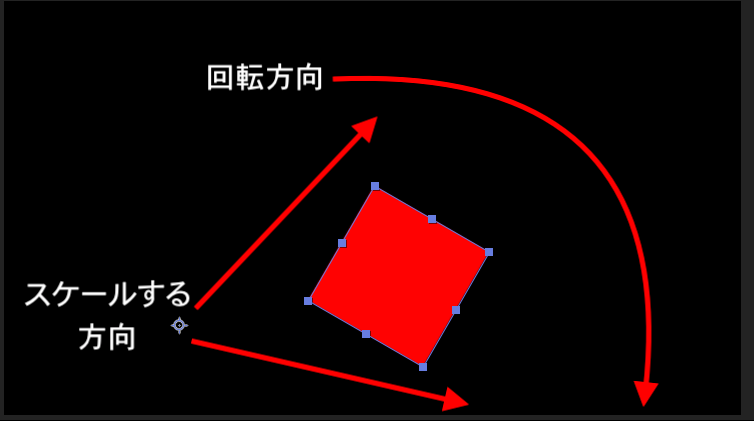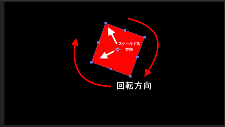 しかし、アンカーポイントをシェイプの中心にすると、大きな円を描くこと無くその場で回転します。スケールの変更もシェイプが動くことが無くサイズ変更が出来るので、簡単に操作できるメリットもあります。
