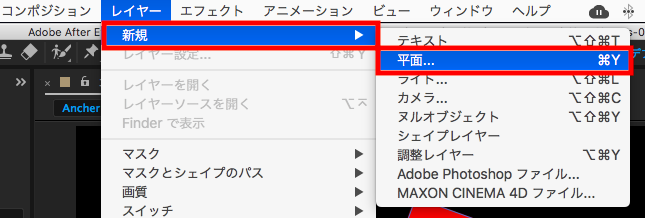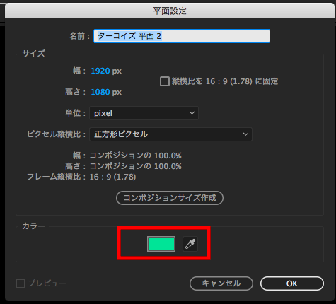 新規コンポジションを作成した後は背景が欲しいので、上部のメニューから「レイヤー」、「平面」を選択して、「カラー」から好きな背景色を選択します。筆者の場合は緑色に近いものにしたいので、ターコイズになりました。
