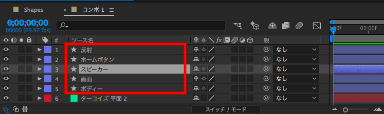 これでスマートフォンのデザインはある程度完了です。ただタイムラインにあるシェイプがわかりにくくなっているので、レイヤー名の名称変更をすると良いでしょう。変更方法はレイヤーを選択して、Enterキーを押すことで名称を変えることが出来ます。